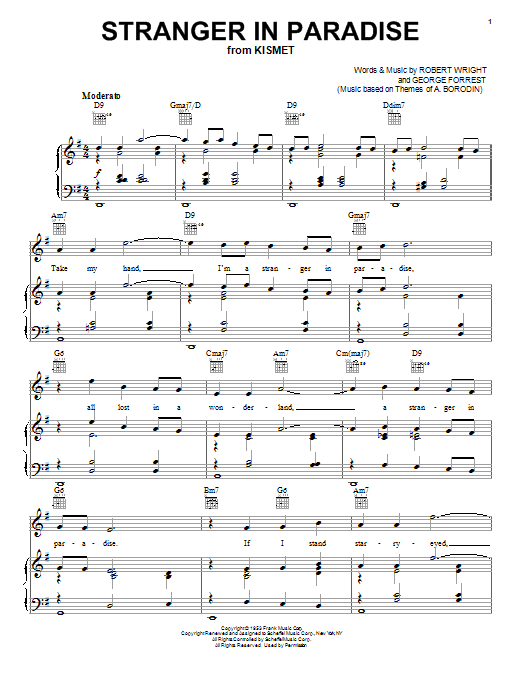 Download or print Robert Wright Stranger In Paradise sheet music, chords and digital score arranged for Easy Lead Sheet / Fake Book. This Jazz score includes 2 page(s).