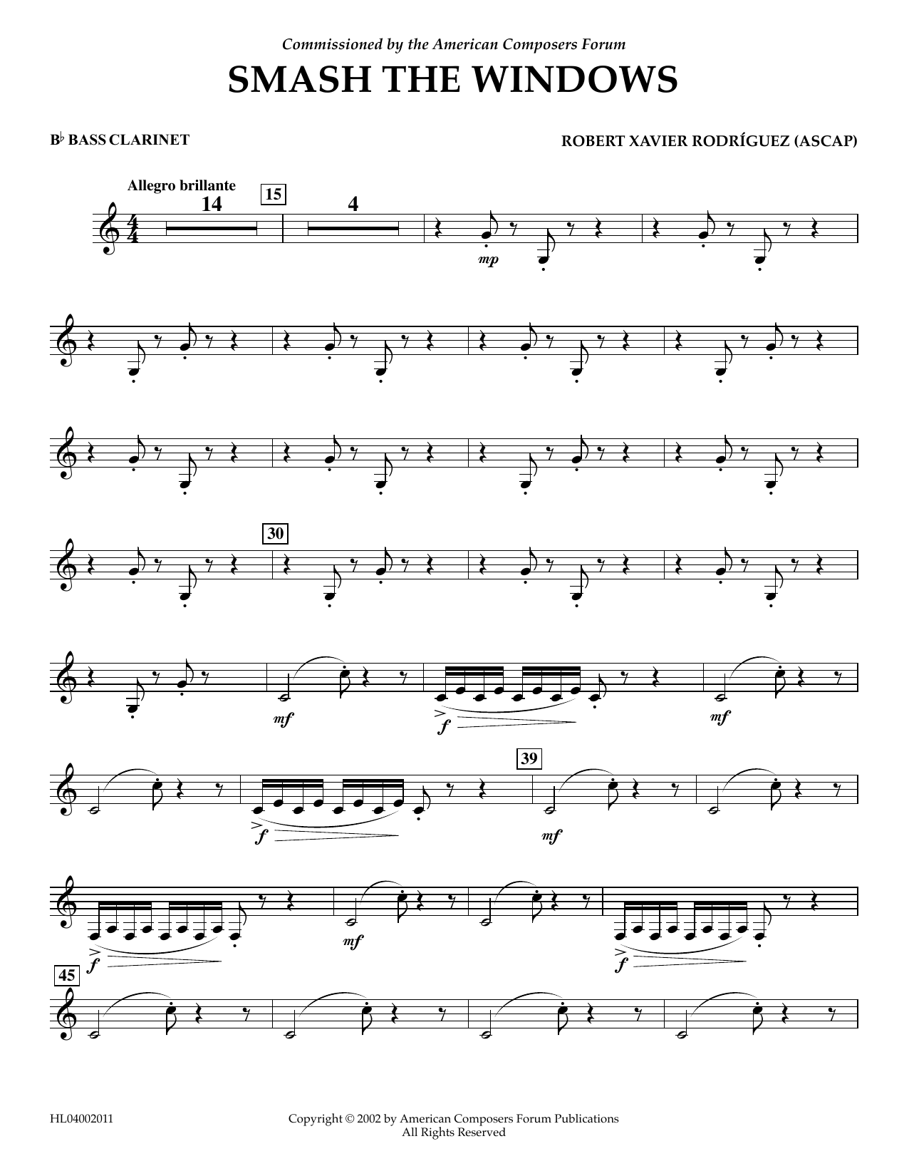 Download or print Robert Xavier Rodríguez Smash the Windows - Bb Bass Clarinet sheet music, chords and digital score arranged for Concert Band. This Concert score includes 2 page(s).
