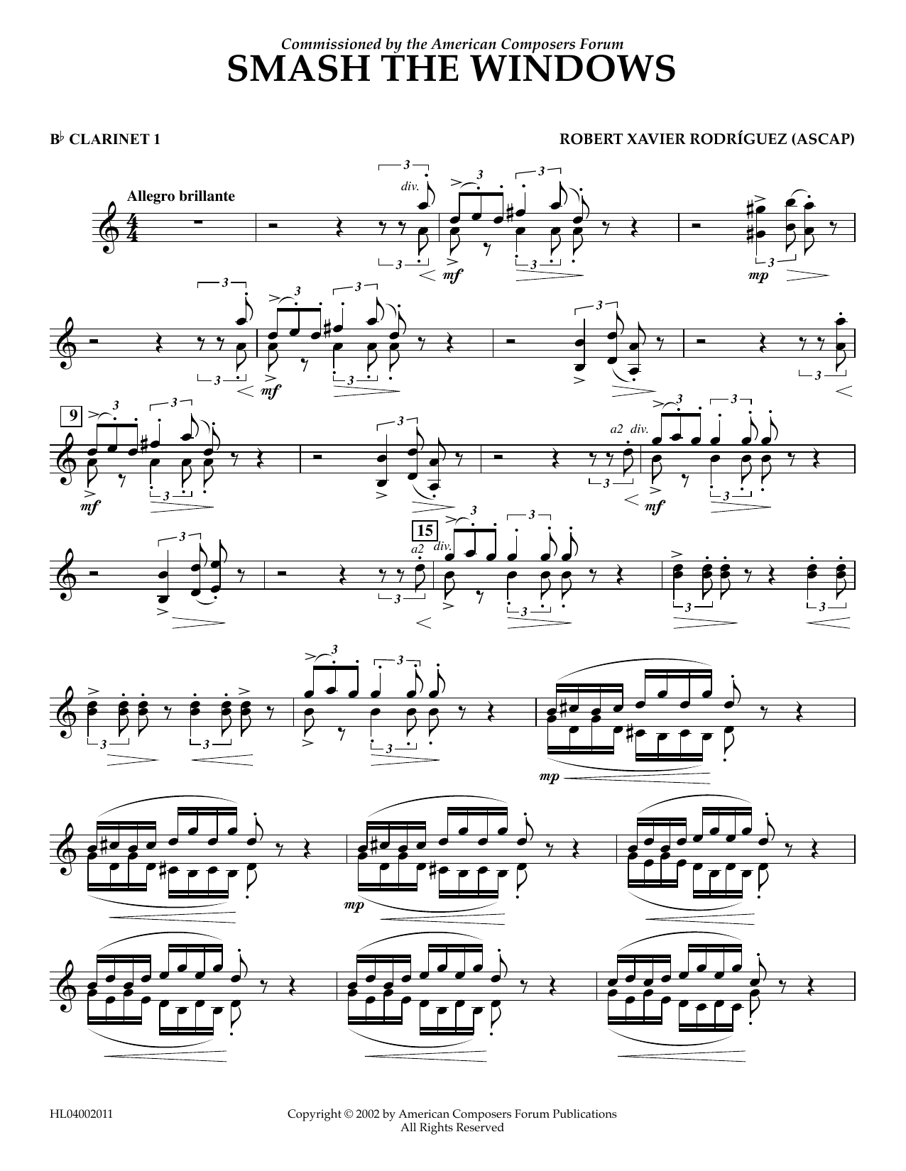 Download or print Robert Xavier Rodríguez Smash the Windows - Bb Clarinet 1 sheet music, chords and digital score arranged for Concert Band. This Concert score includes 3 page(s).