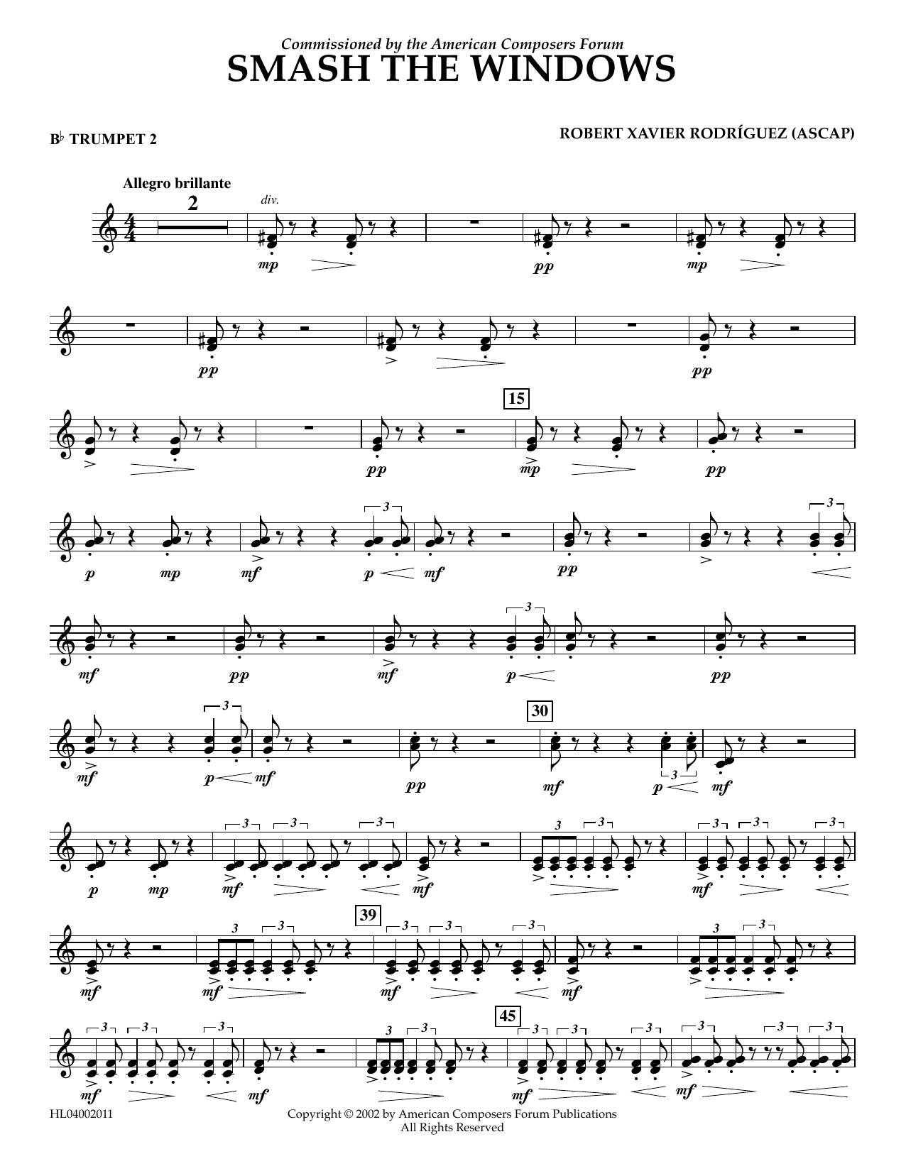 Download or print Robert Xavier Rodríguez Smash the Windows - Bb Trumpet 2 sheet music, chords and digital score arranged for Concert Band. This Concert score includes 2 page(s).