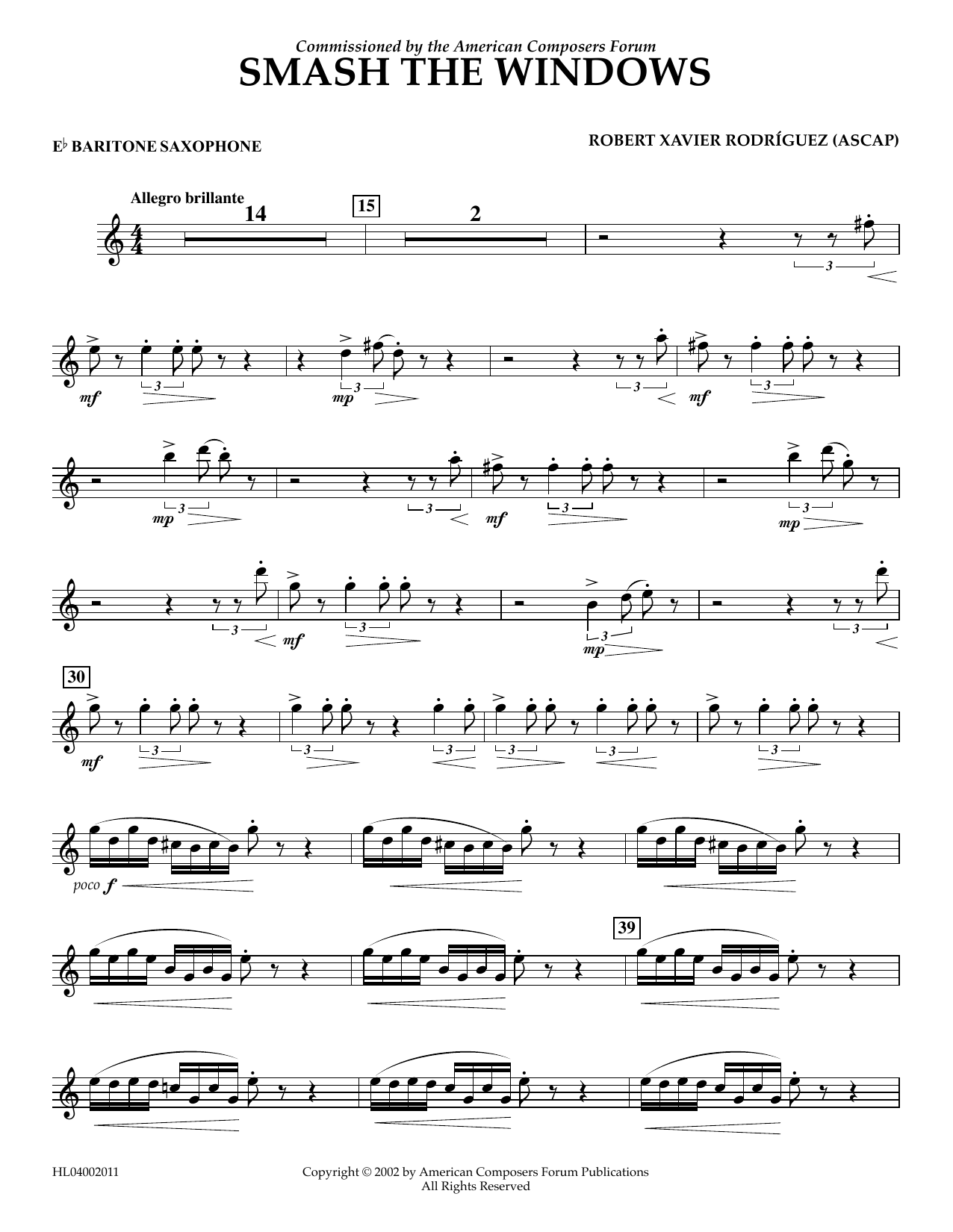 Download or print Robert Xavier Rodríguez Smash the Windows - Eb Baritone Saxophone sheet music, chords and digital score arranged for Concert Band. This Concert score includes 3 page(s).