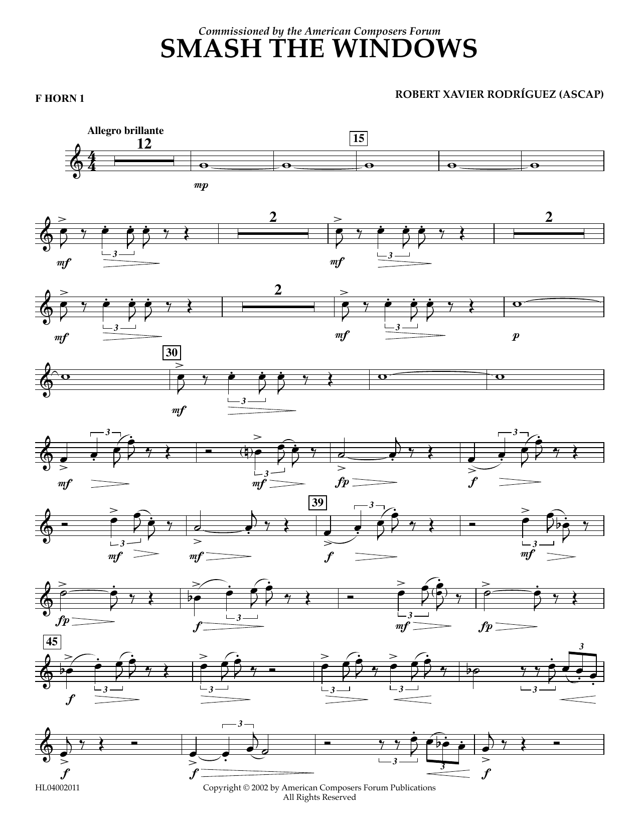 Download or print Robert Xavier Rodríguez Smash the Windows - F Horn 1 sheet music, chords and digital score arranged for Concert Band. This Concert score includes 2 page(s).