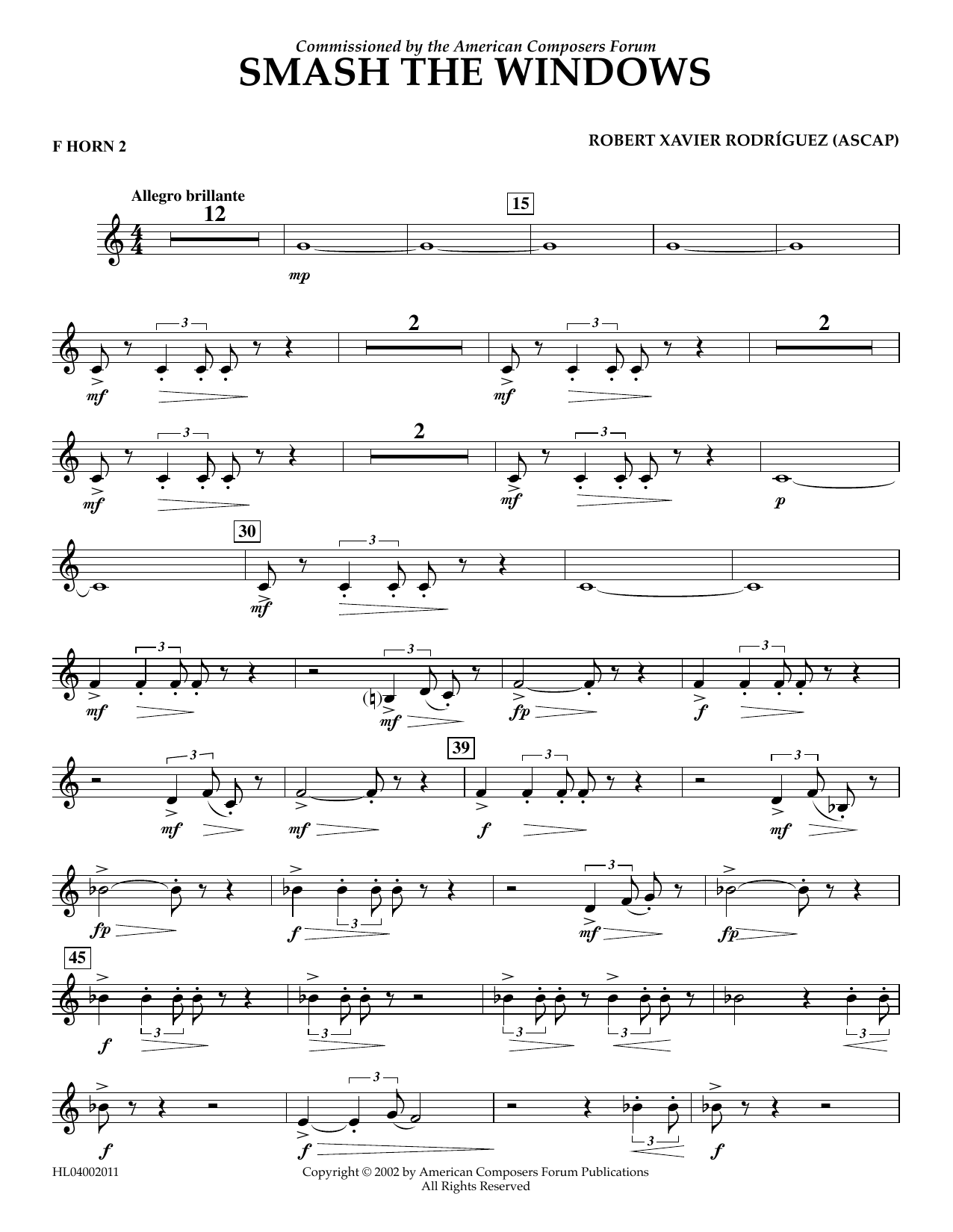 Download or print Robert Xavier Rodríguez Smash the Windows - F Horn 2 sheet music, chords and digital score arranged for Concert Band. This Concert score includes 2 page(s).