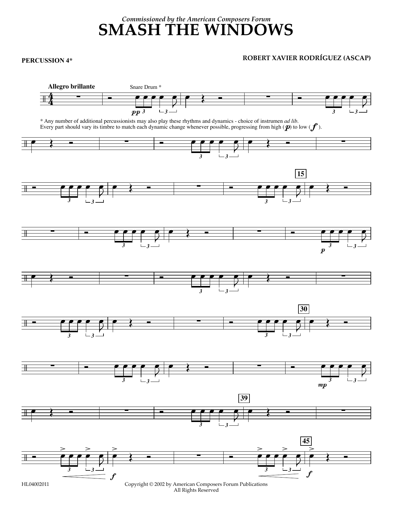 Download or print Robert Xavier Rodríguez Smash the Windows - Percussion 4 sheet music, chords and digital score arranged for Concert Band. This Concert score includes 2 page(s).