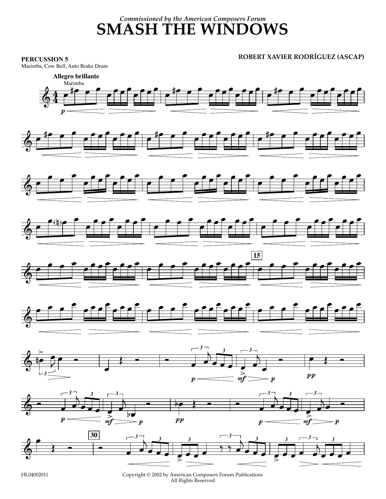 Download or print Robert Xavier Rodríguez Smash the Windows - Percussion 5 sheet music, chords and digital score arranged for Concert Band. This Concert score includes 2 page(s).