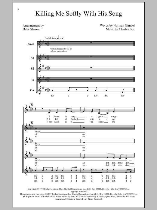 Quick facts Killing Me Softly With His Song (arr. Deke Sharon) about digital sheet music