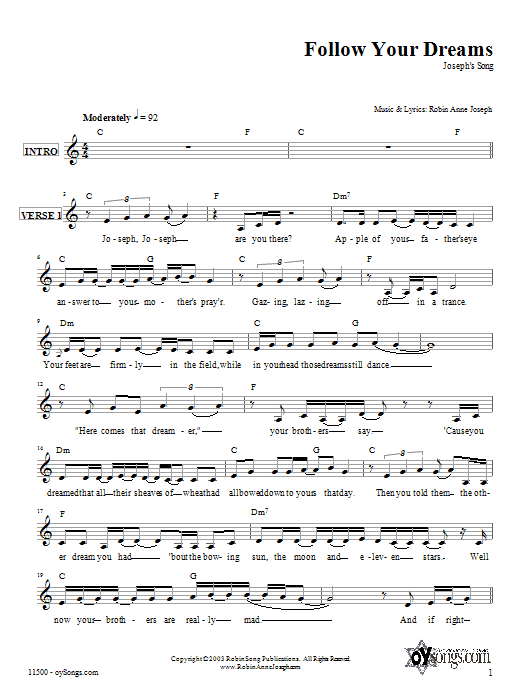Download or print Robin Joseph Follow Your Dreams (Joseph's Song) sheet music, chords and digital score arranged for Lead Sheet / Fake Book. This Traditional score includes 4 page(s).