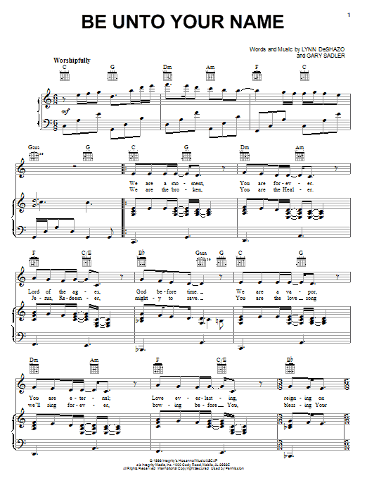 Download or print Robin Mark Be Unto Your Name sheet music, chords and digital score arranged for Big Note Piano. This Christian score includes 3 page(s).
