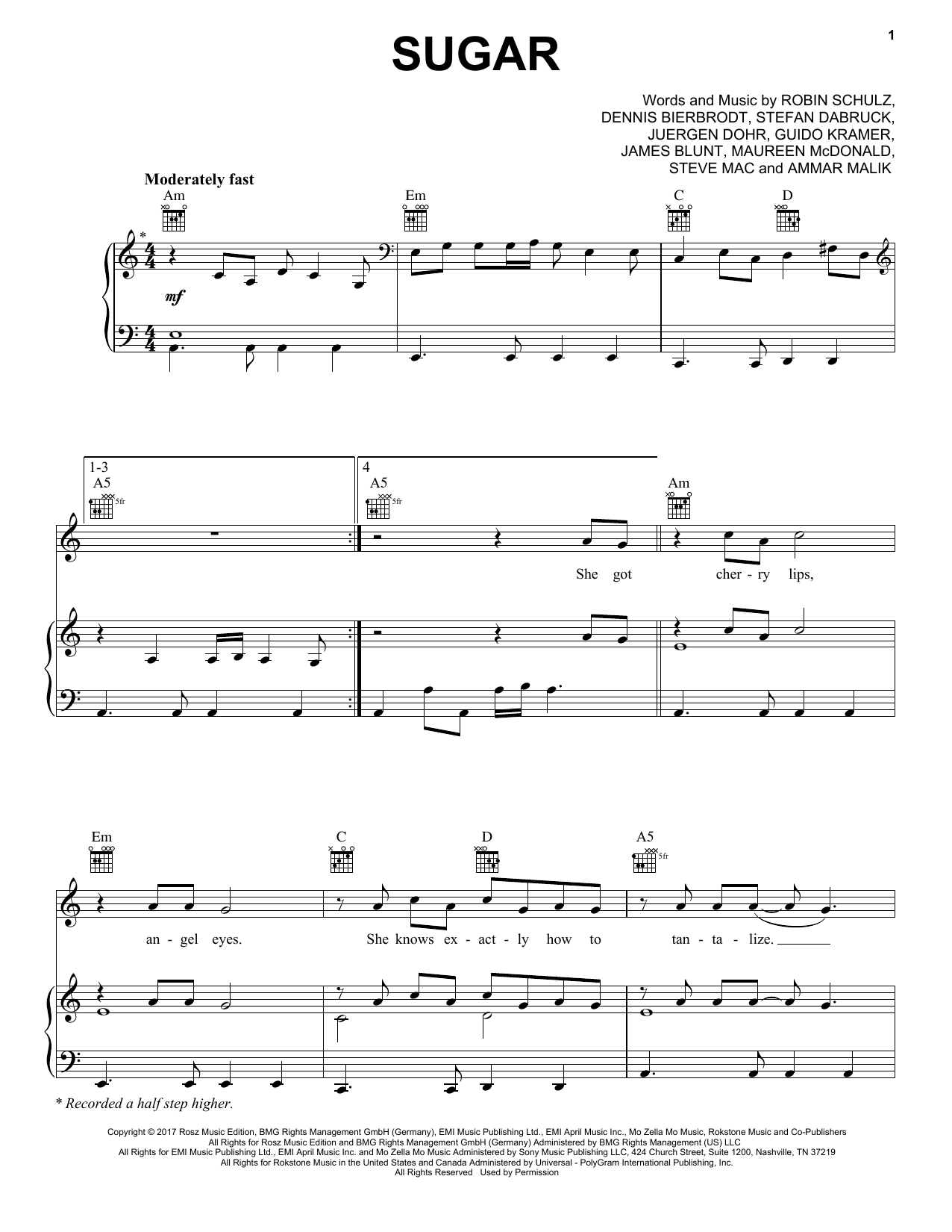 Download or print Robin Schulz Sugar (feat. Francesco Yates) sheet music, chords and digital score arranged for Piano, Vocal & Guitar Chords (Right-Hand Melody). This Pop score includes 7 page(s).
