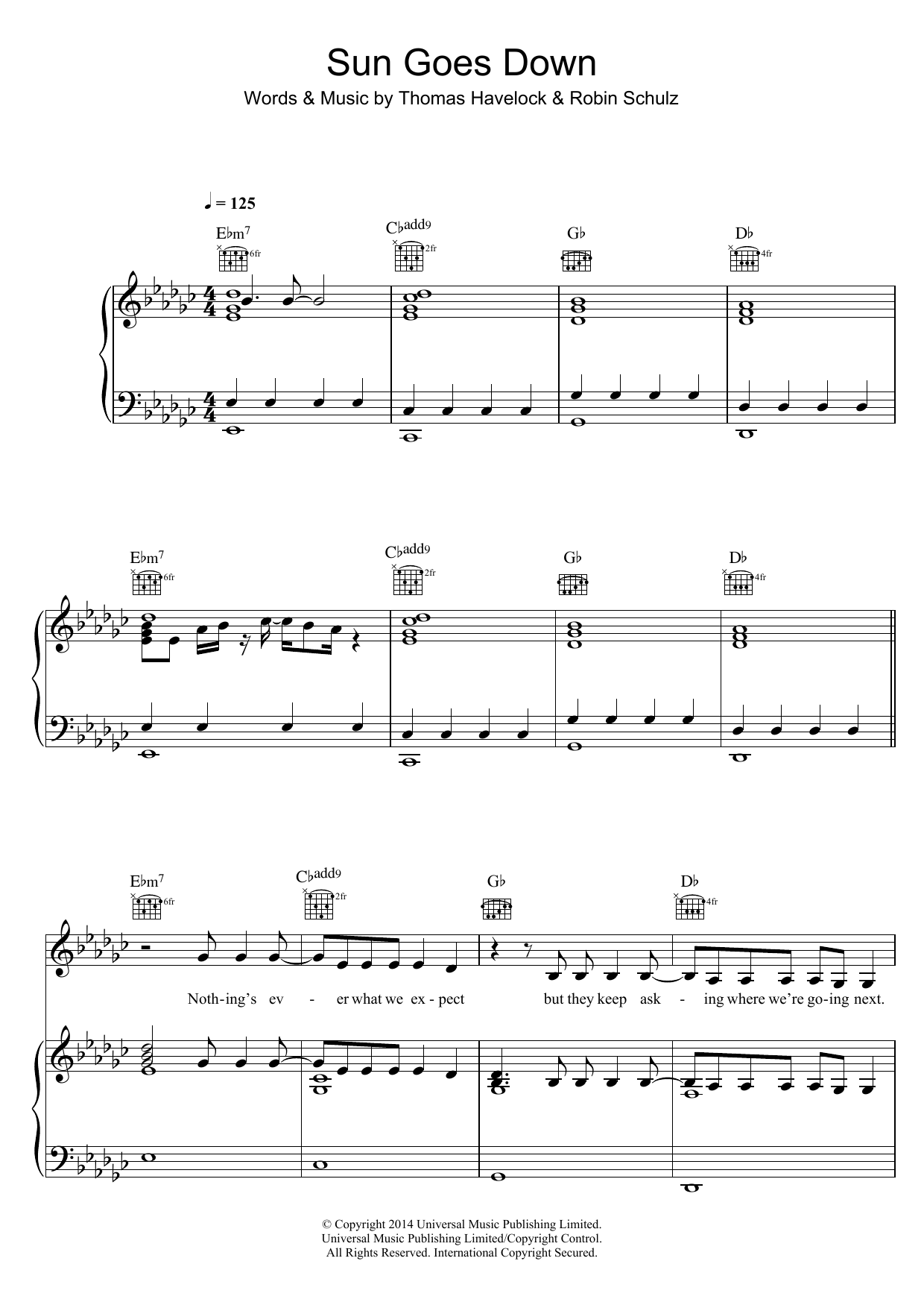 Download or print Robin Schulz Sun Goes Down (feat. Jasmine Thompson) sheet music, chords and digital score arranged for Piano, Vocal & Guitar Chords. This Pop score includes 6 page(s).
