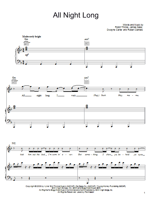Download or print Robin Thicke All Night Long sheet music, chords and digital score arranged for Piano, Vocal & Guitar Chords (Right-Hand Melody). This Pop score includes 11 page(s).