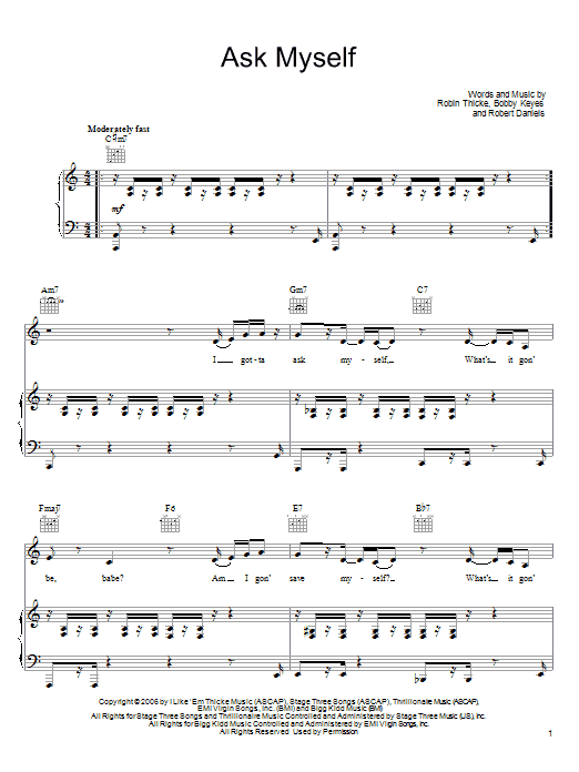 Download or print Robin Thicke Ask Myself sheet music, chords and digital score arranged for Piano, Vocal & Guitar Chords (Right-Hand Melody). This Pop score includes 8 page(s).
