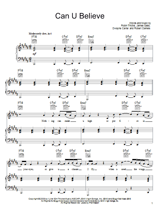 Download or print Robin Thicke Can U Believe sheet music, chords and digital score arranged for Piano, Vocal & Guitar Chords (Right-Hand Melody). This Pop score includes 10 page(s).