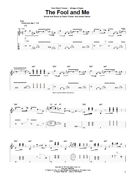 Download or print Robin Trower The Fool And Me sheet music, chords and digital score arranged for Guitar Tab. This Blues score includes 10 page(s).