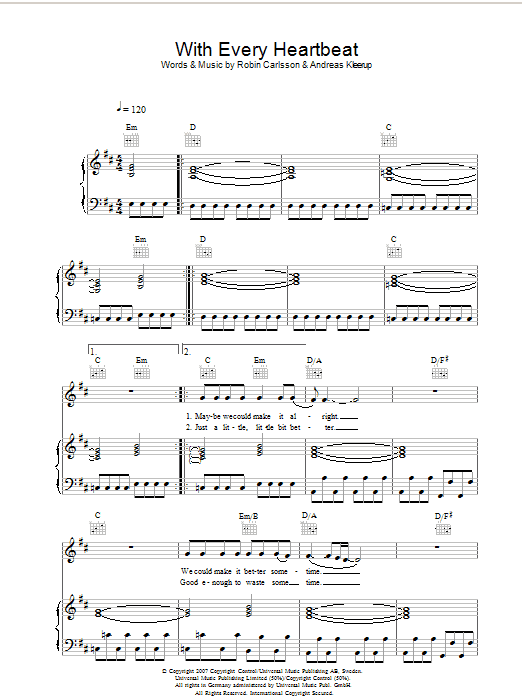 Download or print Robyn With Every Heartbeat sheet music, chords and digital score arranged for Piano Chords/Lyrics. This Pop score includes 2 page(s).