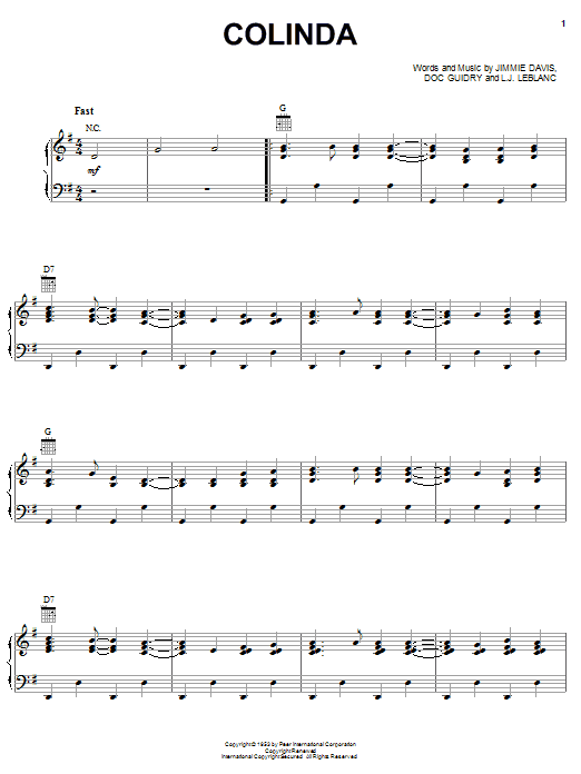 Download or print Rockin' Dopsie & The Cajun Twisters Colinda sheet music, chords and digital score arranged for Piano, Vocal & Guitar Chords (Right-Hand Melody). This Country score includes 3 page(s).