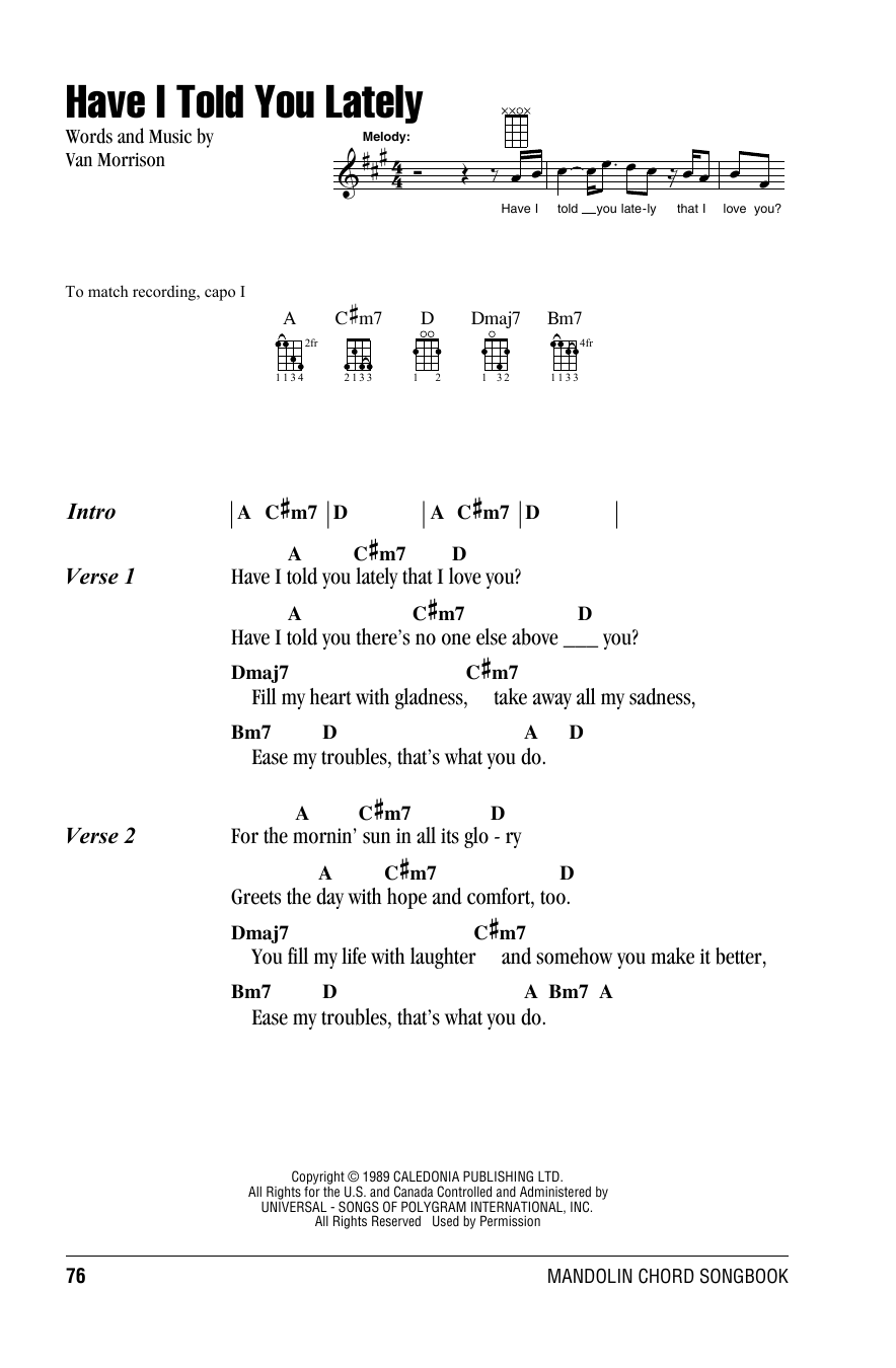 Download or print Rod Stewart Have I Told You Lately sheet music, chords and digital score arranged for Mandolin Chords/Lyrics. This Love score includes 2 page(s).