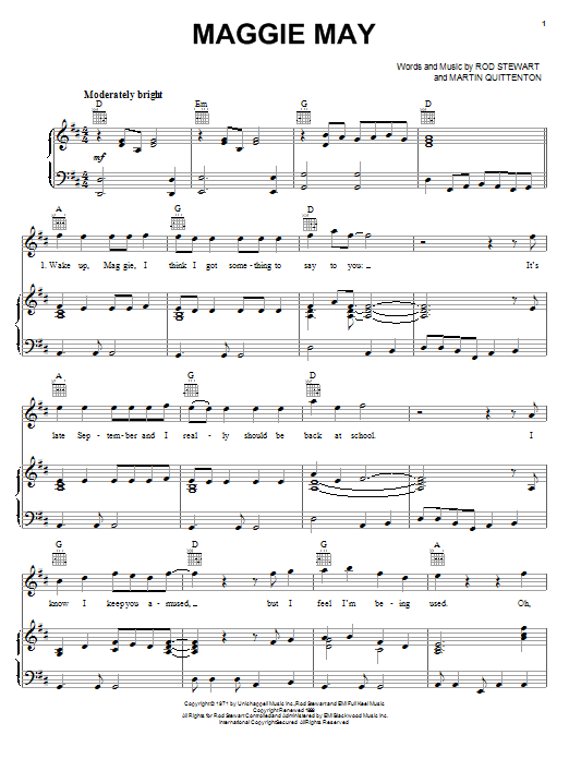 Download or print Rod Stewart Maggie May sheet music, chords and digital score arranged for Easy Piano. This Pop score includes 5 page(s).