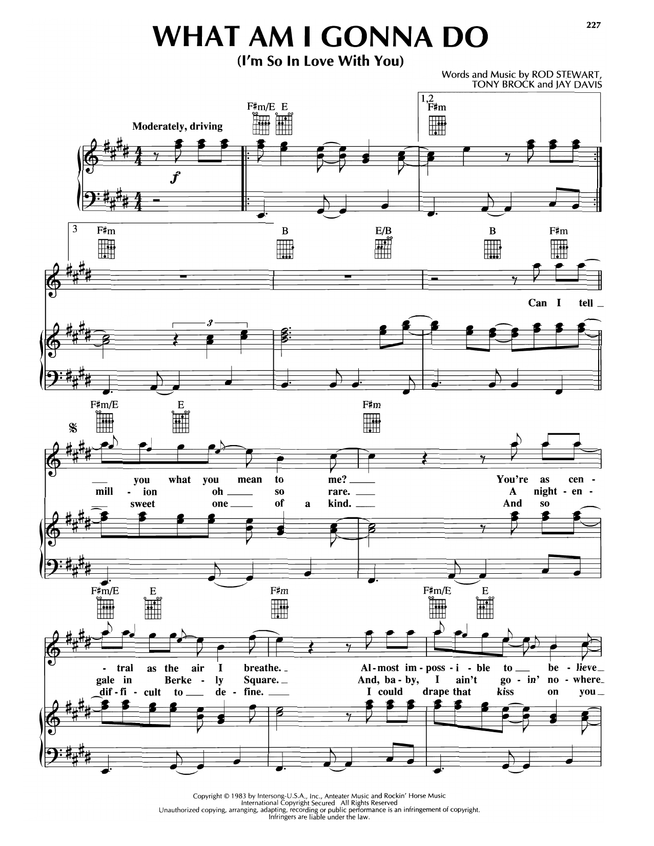 Download or print Rod Stewart What Am I Gonna Do (I'm So In Love With You) sheet music, chords and digital score arranged for Piano, Vocal & Guitar Chords (Right-Hand Melody). This Rock score includes 5 page(s).
