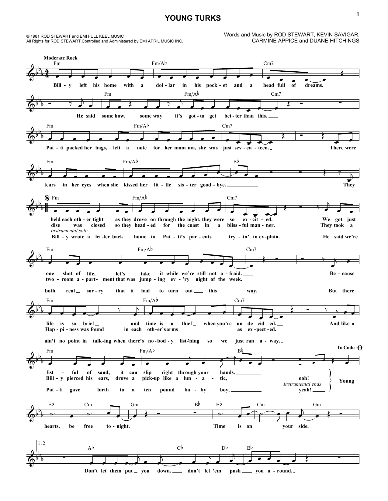 Download or print Rod Stewart Young Turks sheet music, chords and digital score arranged for Piano, Vocal & Guitar Chords (Right-Hand Melody). This Rock score includes 5 page(s).