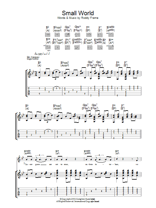 Download or print Roddy Frame Small World sheet music, chords and digital score arranged for Guitar Chords/Lyrics. This Rock score includes 2 page(s).