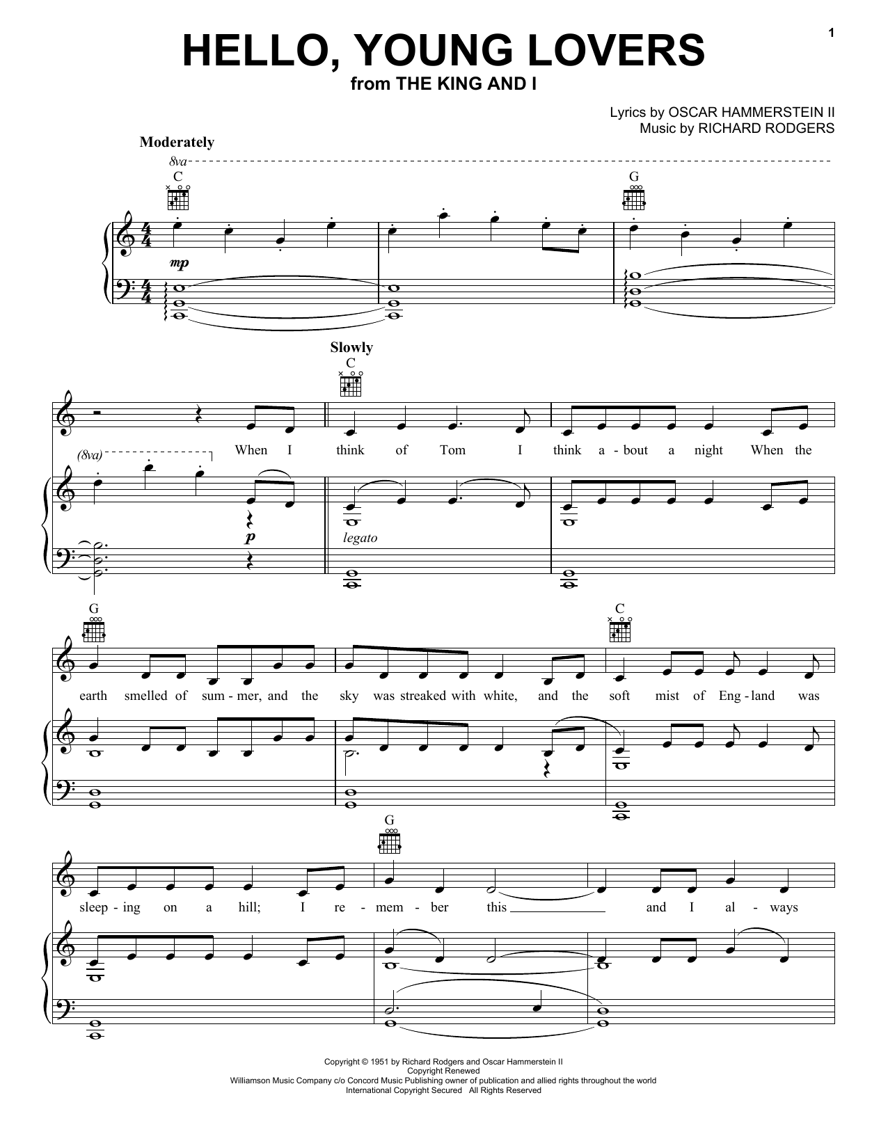 Download or print Rodgers & Hammerstein Hello, Young Lovers sheet music, chords and digital score arranged for Piano, Vocal & Guitar Chords (Right-Hand Melody). This Film/TV score includes 6 page(s).
