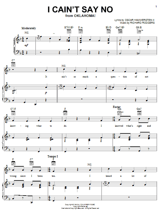 Download or print Rodgers & Hammerstein I Cain't Say No (from Oklahoma!) sheet music, chords and digital score arranged for Piano & Vocal. This Musical/Show score includes 7 page(s).