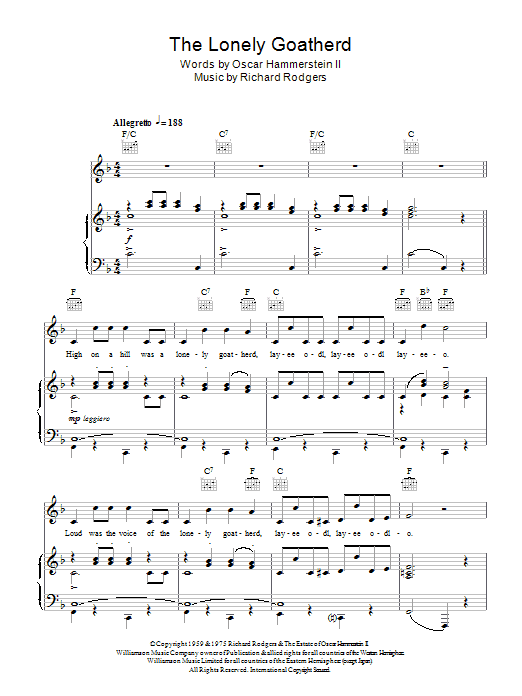 Download or print Rodgers & Hammerstein The Lonely Goatherd sheet music, chords and digital score arranged for Beginning Piano Solo. This Film/TV score includes 3 page(s).