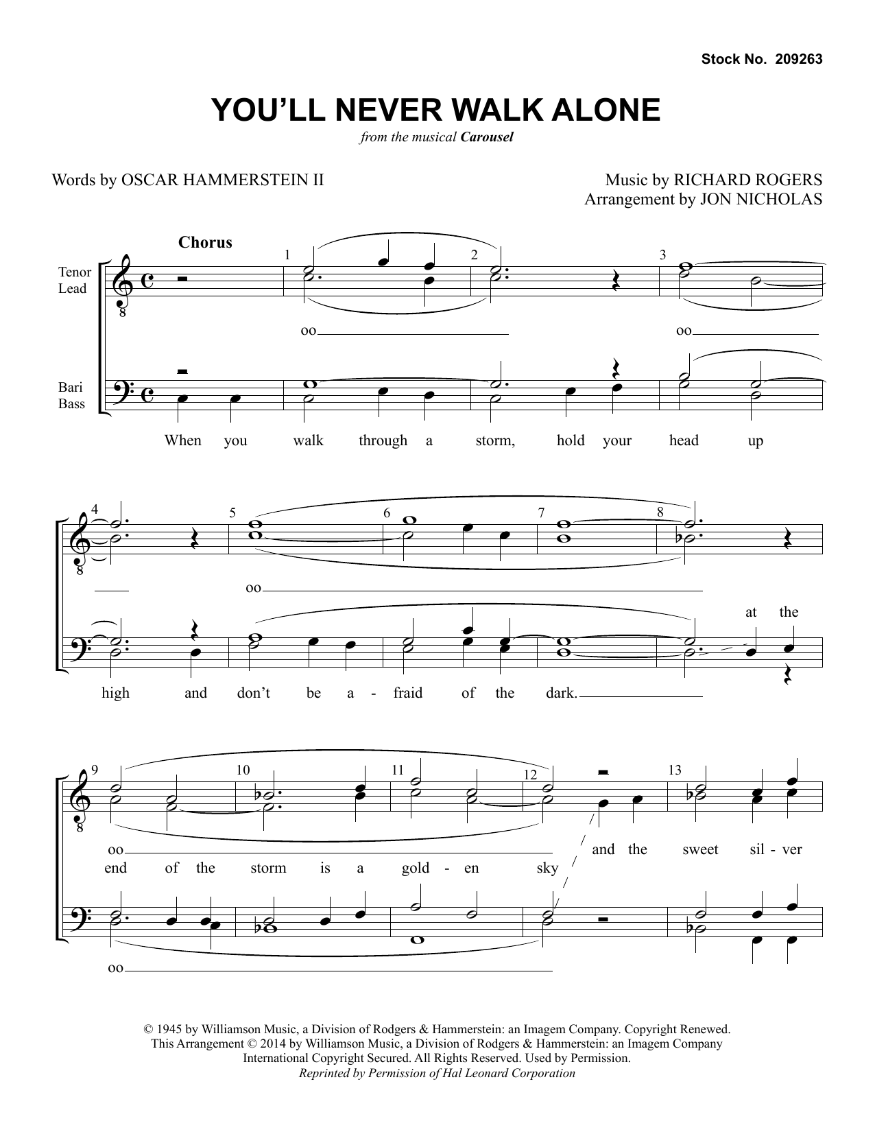 Download or print Rodgers & Hammerstein You'll Never Walk Alone (from Carousel) (arr. Jon Nicholas) sheet music, chords and digital score arranged for SSAA Choir. This Barbershop score includes 4 page(s).