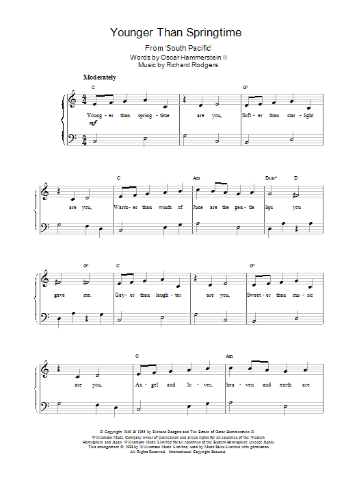 Download or print Rodgers & Hammerstein Younger Than Springtime sheet music, chords and digital score arranged for Piano, Vocal & Guitar Chords. This Love score includes 4 page(s).