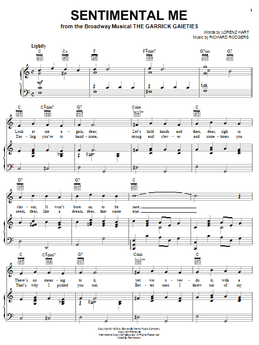 Download or print Rodgers & Hart Sentimental Me sheet music, chords and digital score arranged for Real Book – Melody & Chords – C Instruments. This Jazz score includes 1 page(s).