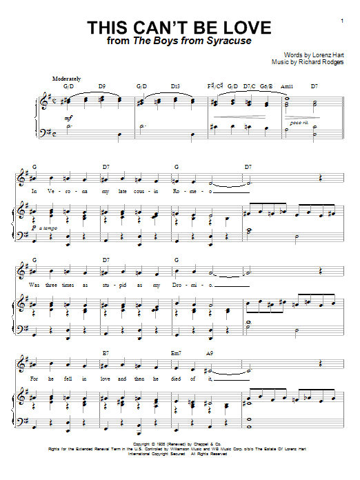 Download or print Rodgers & Hart This Can't Be Love sheet music, chords and digital score arranged for Easy Piano. This Jazz score includes 3 page(s).