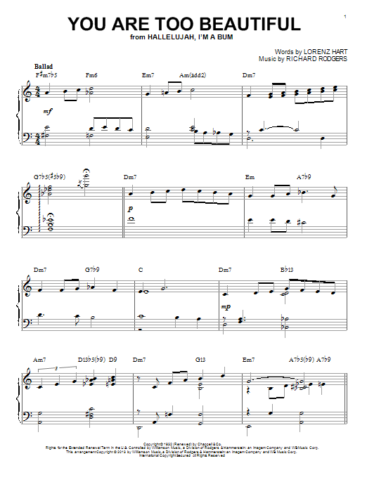Download or print Rodgers & Hart You Are Too Beautiful (arr. Brent Edstrom) sheet music, chords and digital score arranged for Piano Solo. This Jazz score includes 3 page(s).
