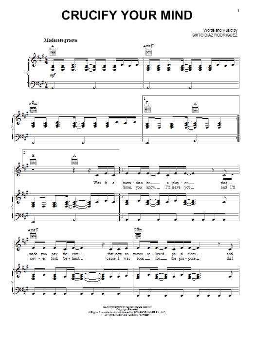 Download or print Rodriguez Crucify Your Mind sheet music, chords and digital score arranged for Piano, Vocal & Guitar Chords (Right-Hand Melody). This Pop score includes 3 page(s).