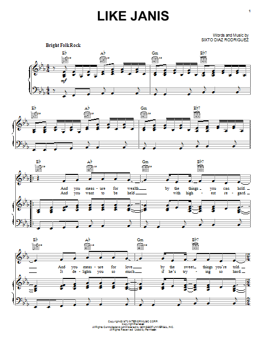 Download or print Rodriguez Like Janis sheet music, chords and digital score arranged for Piano, Vocal & Guitar Chords (Right-Hand Melody). This Pop score includes 6 page(s).