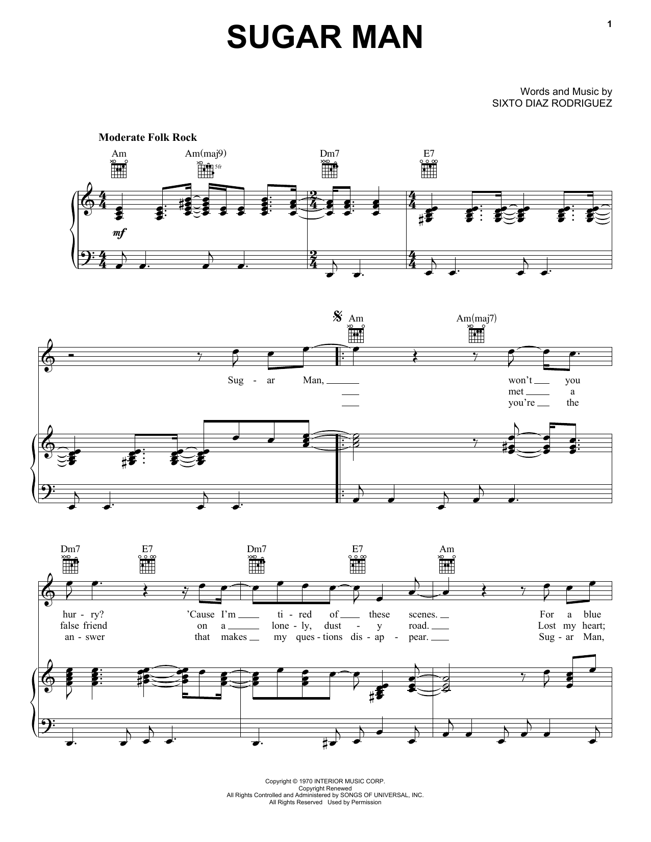 Download or print Rodriguez Sugar Man sheet music, chords and digital score arranged for Piano, Vocal & Guitar Chords (Right-Hand Melody). This Pop score includes 5 page(s).