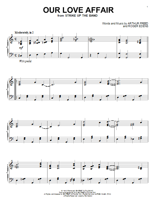 Download or print Roger Edens Our Love Affair sheet music, chords and digital score arranged for Piano Solo. This Jazz score includes 4 page(s).