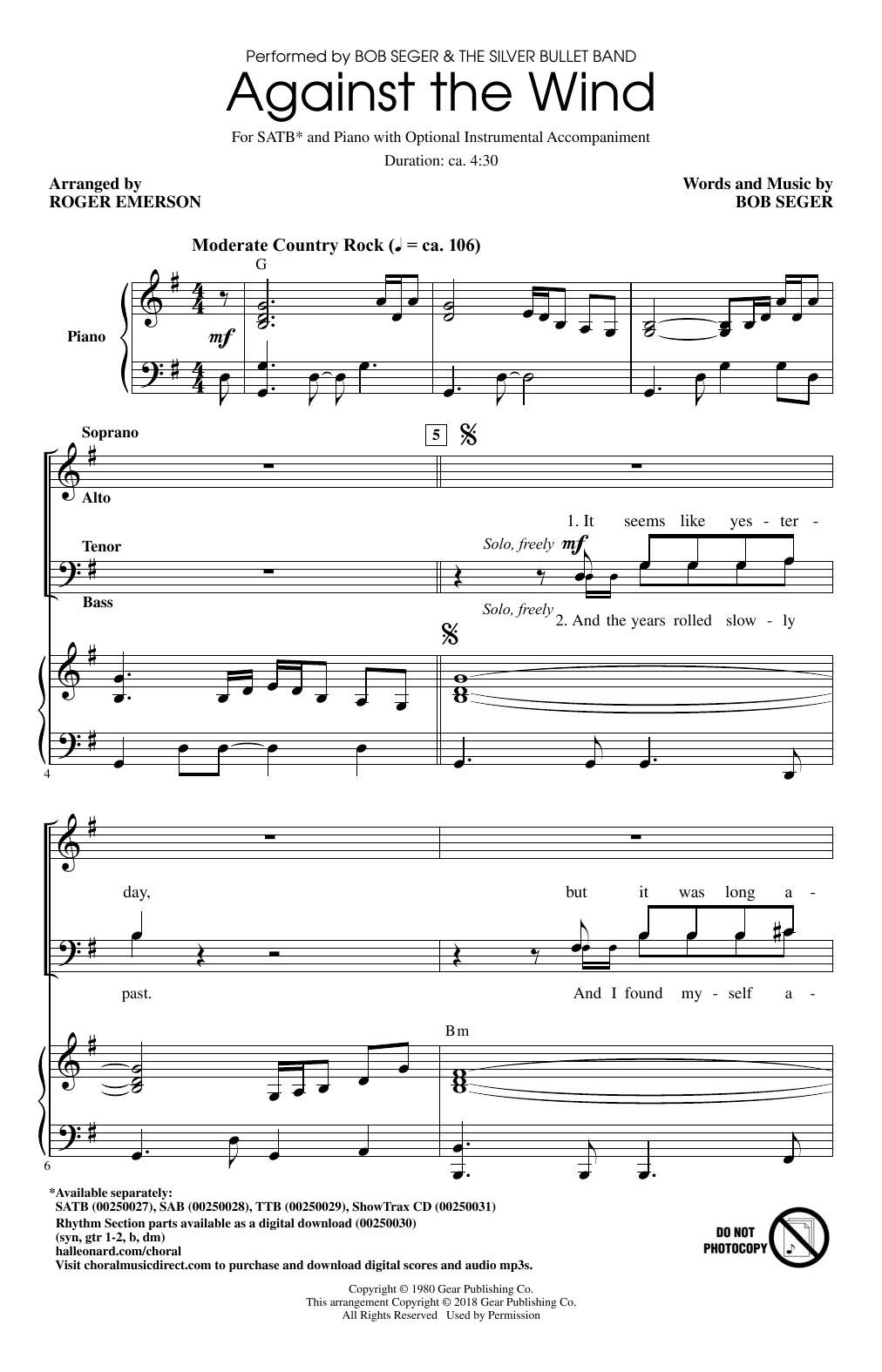 Download or print Roger Emerson Against The Wind sheet music, chords and digital score arranged for SAB Choir. This Pop score includes 15 page(s).