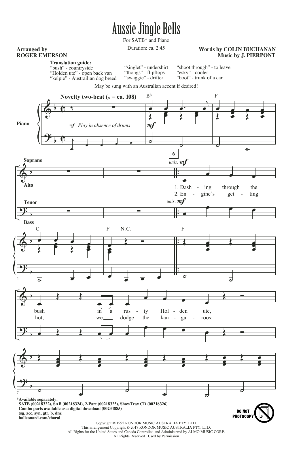 Download or print Roger Emerson Aussie Jingle Bells sheet music, chords and digital score arranged for 2-Part Choir. This Christmas score includes 11 page(s).