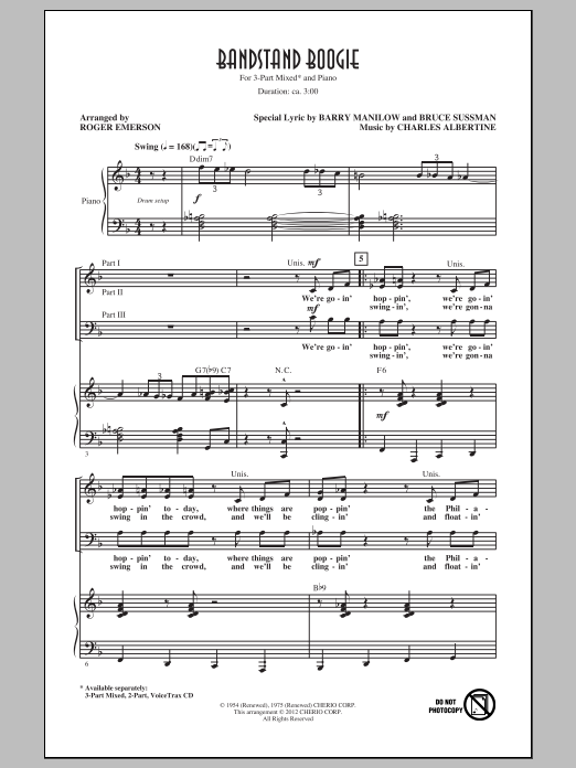 Download or print Roger Emerson Bandstand Boogie sheet music, chords and digital score arranged for 3-Part Mixed Choir. This Jazz score includes 13 page(s).
