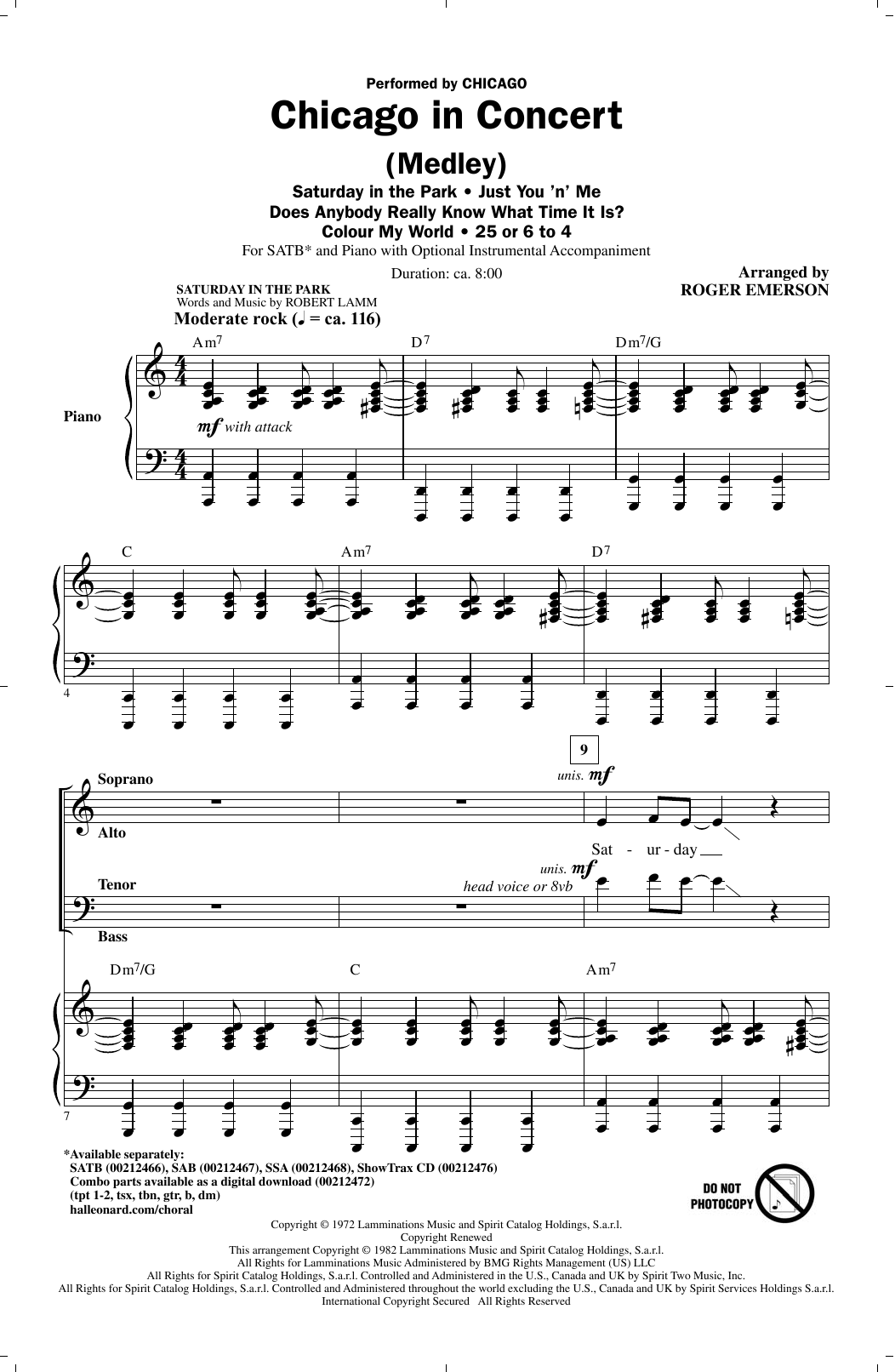 Download or print Roger Emerson Chicago In Concert (Medley) sheet music, chords and digital score arranged for SAB Choir. This Pop score includes 23 page(s).