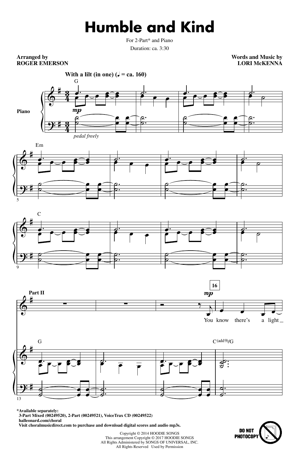 Download or print Roger Emerson Humble And Kind sheet music, chords and digital score arranged for 3-Part Mixed Choir. This Country score includes 14 page(s).