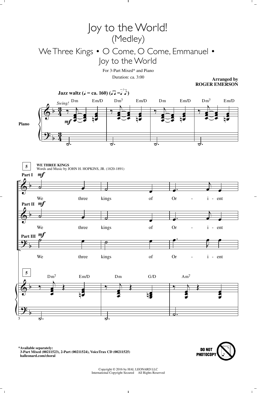 Download or print Roger Emerson Joy To The World! (Medley) sheet music, chords and digital score arranged for 3-Part Mixed Choir. This Christmas score includes 14 page(s).