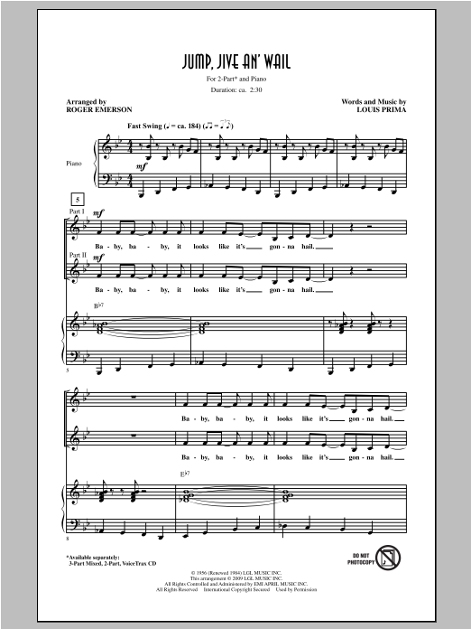 Download or print Roger Emerson Jump, Jive An' Wail sheet music, chords and digital score arranged for 3-Part Mixed Choir. This Jazz score includes 11 page(s).