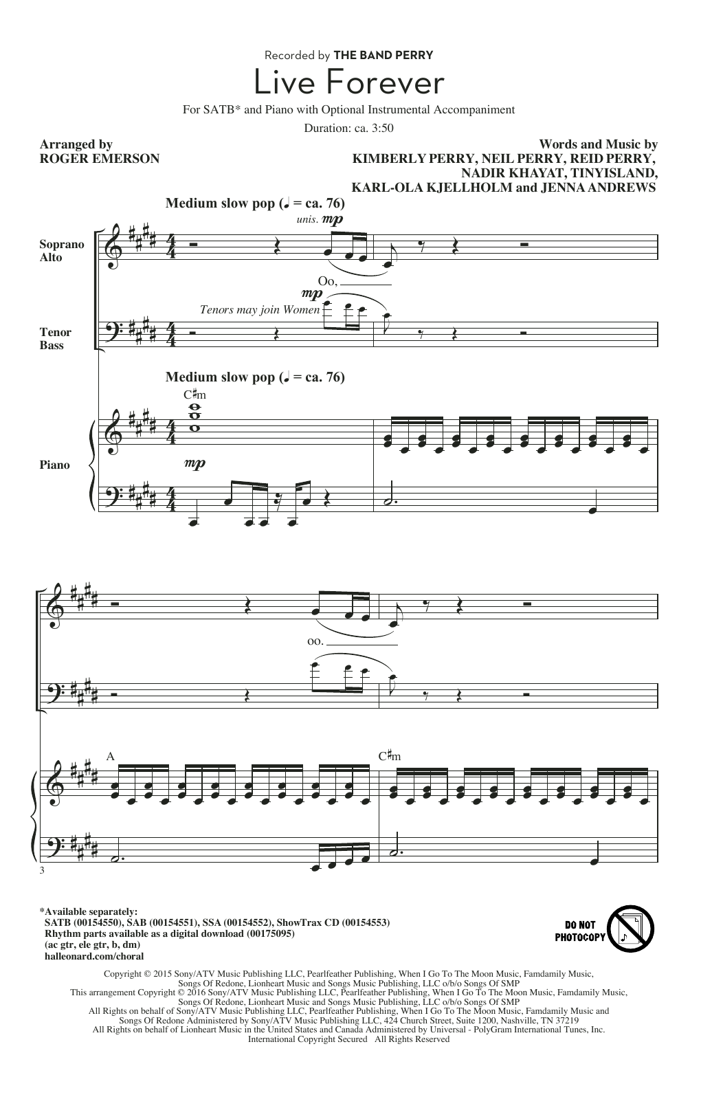 Download or print The Band Perry Live Forever (arr. Roger Emerson) sheet music, chords and digital score arranged for SSA Choir. This Pop score includes 14 page(s).