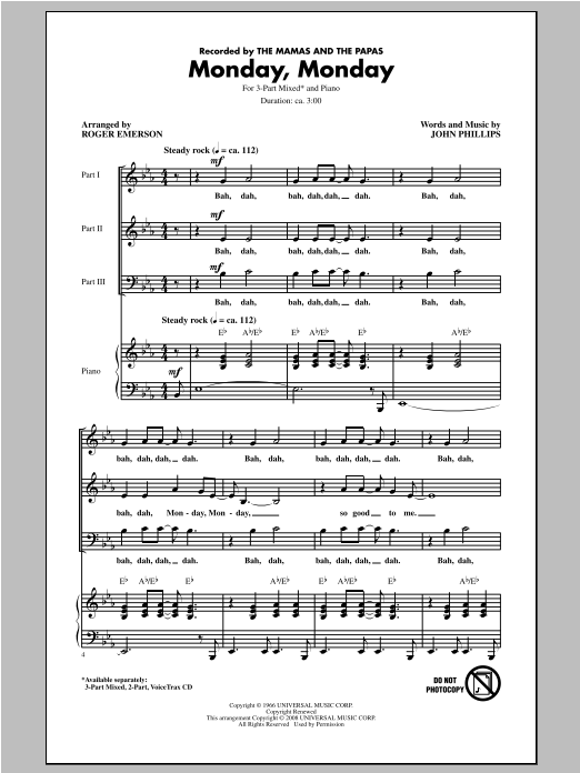 Download or print The Mamas & The Papas Monday, Monday (arr. Roger Emerson) sheet music, chords and digital score arranged for 3-Part Mixed Choir. This Oldies score includes 15 page(s).
