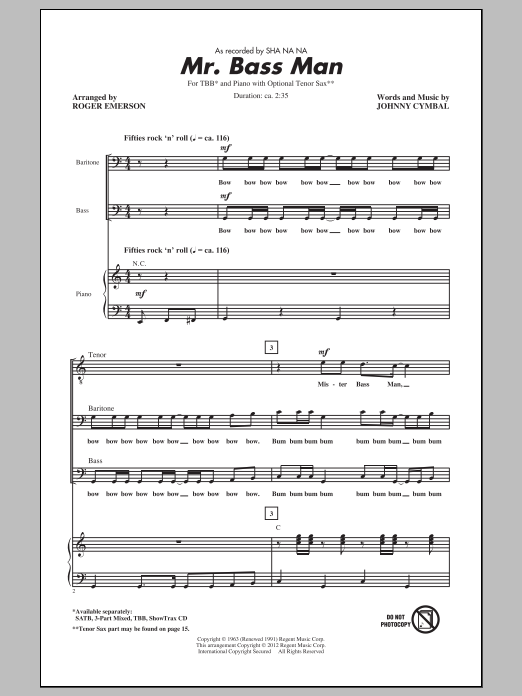 Download or print Roger Emerson Mr. Bass Man sheet music, chords and digital score arranged for 3-Part Mixed Choir. This Oldies score includes 14 page(s).