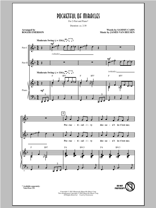 Download or print Roger Emerson Pocketful Of Miracles sheet music, chords and digital score arranged for 2-Part Choir. This Standards score includes 7 page(s).