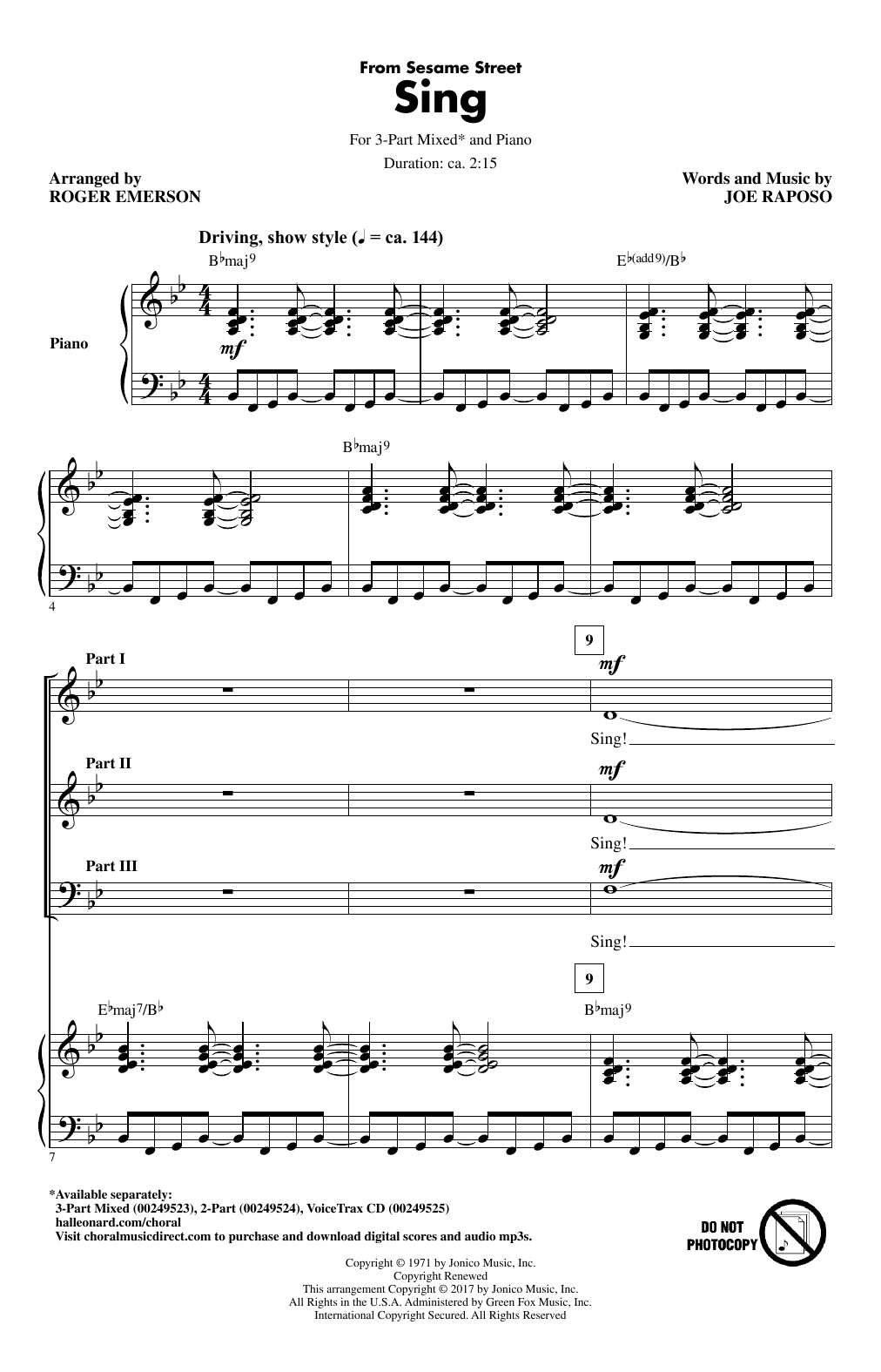 Download or print Joe Raposo Sing (from Sesame Street) (arr. Roger Emerson) sheet music, chords and digital score arranged for 3-Part Mixed Choir. This Children score includes 13 page(s).
