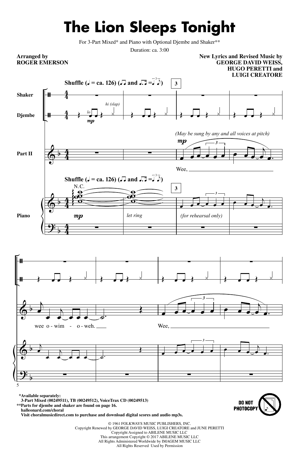 Download or print Roger Emerson The Lion Sleeps Tonight sheet music, chords and digital score arranged for 3-Part Mixed Choir. This Oldies score includes 14 page(s).